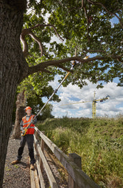 • XR 18V Li-Ion 5Ah BRUSHLESS POLE PRUNER. 2 to 3 m telescopic shaft with a reach of up to 4.5 m. 20 cm long bar and low-kickback chain. It has a metal hook to secure the bar and cut branches more easily. Automatic lubrication and dual switch for maximum safety. Optimal weight and balance. It can make up to 55 10 cm x 10 cm cuts on a single charge.