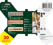 - 11 HSS-TiN metal drill bits, Ø 1.5-6.5 mm 4 masonry drill bits, Ø 4-7 mm 4 wood drill bits, Ø 4-8 mm 10 screwdriver bits, L = 25 mm PH 1/2/3 PZ 1/2/3 S 4/6 T 20/25 1 universal holder, magnetic 1 countersink