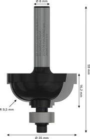- Edging tip: E, 8 mm, R1 9.5 mm, D 35 mm, W 16.2 mm, G 59 mm: For profiling edges