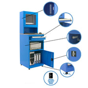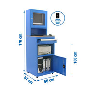 - Welded computer cabinet. Includes leveling feet. Includes a 4-socket power cord. Includes a set of two unique keys for the expansion lock and the monitor lock. The monitor section is secured with a tilt-and-turn window made of metal frame and 2mm thick Plexiglas. Ventilation panels on the back. Protects the computer from pollution and impacts in the workshop. The keyboard is hidden in a removable drawer. Has an external table for documents and tools. Includes a single-shelf cabinet and an external access shelf. Delivered assembled.
