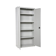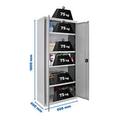 • Gray metal multipurpose cabinet with gray doors. With 2 doors and 4 shelves with a load capacity of 75 kg each, certified load at the bending point.Delivered assembled.The cabinet dimensions (height x width x depth) are: 1800 x 600 x 400 mm.Safe to handle, no sharp edges.With scratch-resistant and fire-resistant epoxy polyester coating. Made in Spain.