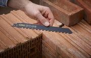 • Bi-metal reciprocating saw blade, length: 240 mm, tooth pitch: 12.7 mm, tungsten carbide blade for cutting aerated concrete, red brick, and fiber cement up to 150 mm