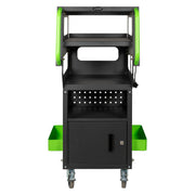 - Multifunction workshop trolley with four trays and a lockable compartment. It features two handles and swivel wheels that make transportation very comfortable. It also includes a perforated panel, a paper roll holder, and two side trays for tool storage. Suitable for placing laptops, testers, and battery chargers.