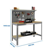 - Grey/wood metal workbench with a load capacity of 400 kg. Dimensions (height x width x depth) are 1445 x 910 x 610 mm. This is a Spanish product, European quality. You can find the assembly instructions inside or at this link: https://www.Youtube.com/watch?v=4vv38d3Jns0. Product dimensions in use: 1445 x 910 x 610 mm.