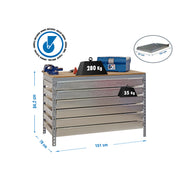 - Screwless workbench with a wooden shelf. Includes multiple drawers with telescopic guides for tool storage. The main wooden shelf has a load capacity of 600 kg. The drawers can hold up to 35 kg each. With casters, the shelving unit has a total load capacity of 120 kg, evenly distributed. Quick and easy assembly. Safe to handle, with no sharp edges. Made in Spain. Product dimensions in use: 917 x 1510 x 760 mm