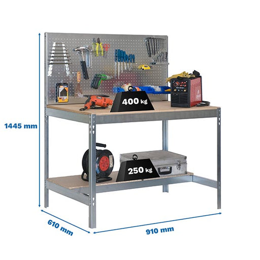 Product Overview: Grey/wood metal workbench with a load capacity of 400 kg. Dimensions (height x width x depth) are 1445 x 910 x 610 mm. This is a ...