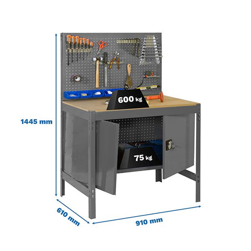 View full detailsProduct Overview: Anthracite/wood metal workbench with a load capacity of 600 kg. Dimensions (height x width x depth) are 1445 x 1510 x 610 mm. Inc...