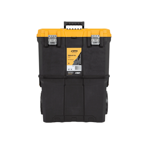Product Overview: Tool box roller trolley XL, equipped with a retractable handle , removable tool tray, lid with 2 tray compartments, heavy duty la...