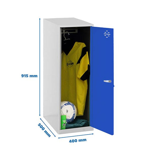 Product Overview: Mini metal locker in GREY with a BLUE door. Dimensions are 915x400x500mm. Delivered assembled, it includes a vent to keep the int...