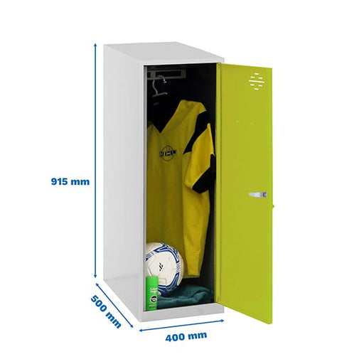 Product Overview: Mini metal locker in GREY with a GREEN door. Dimensions are 915x400x500mm. Delivered assembled, it includes a vent to keep the in...