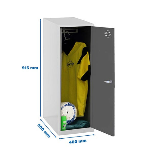 Product Overview: Mini metal locker in LOCKER GREY and GRAY door. Dimensions are 915x400x500mm. It is delivered assembled and includes a vent to ke...