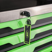 • Its centralized locking system ensures the drawers stay securely closed, preventing accidental openings. The top tray with dedicated compartments for tools and small parts helps you work more efficiently.