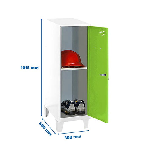 Product Overview: Mini metal locker with WHITE legs and GREEN doors. Dimensions are 1015 x 300 x 500 mm. It is delivered unassembled and includes a...