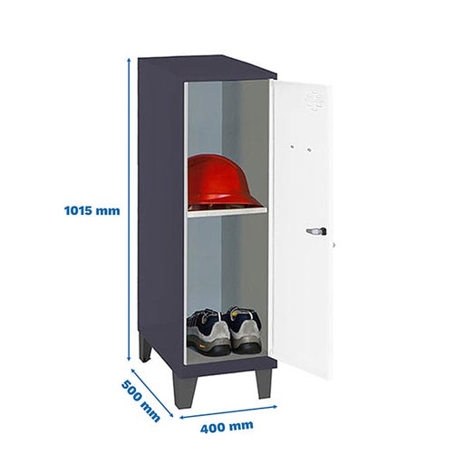 Product Overview: Mini metal locker with anthracite legs and blue doors. Dimensions are 1015 x 400 x 500 mm. It is delivered disassembled and inclu...