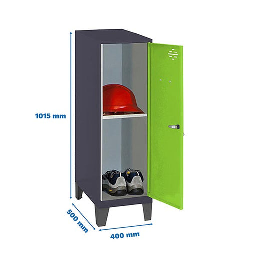 Product Overview: Mini metal locker with anthracite-colored legs and green doors. Dimensions are 1015 x 400 x 500 mm. It is delivered disassembled ...