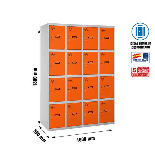 View full detailsProduct Overview: Gray metal locker. Delivered disassembled. It has 4 sections and 16 doors. It includes a lock, keys, and a name tag. Made in Spai...
