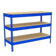 • Metal workbench with three boltless shelves, measuring 900 x 1800 x 450 mm. Each shelf can hold 400 kg. Blue/wood color.