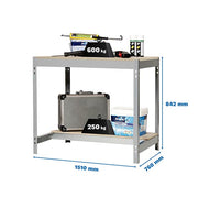 - Grey/wood metal workbench with a load capacity of 600 kg. Dimensions (height x width x depth) are 842 x 1510 x 760 mm. This is a Spanish product of European quality. You can find the assembly instructions inside or at this link: https://www.Youtube.com/watch?v=GpZpB8AIjro. Product dimensions in use: 842 x 1510 x 760 mm