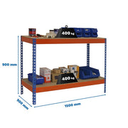 - Metal workbench with screwless assembly and two chipboard shelves. Each shelf supports up to 400 kg. Safe handling, no sharp edges. Ideal for a workshop or storage room. Made in Spain. Product