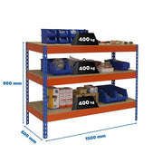 - Metal workbench with three chipboard shelves and no-screw assembly. Each shelf supports up to 400 kg. Safe handling, no sharp edges. Ideal for a workshop or storage room. Made in Spain. Product
