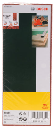- 25 sanding sheets clamped 8 holes (B+D) 93 x 230 mm 5 of which: Grit 60 5 of which: Grit 80 5 of which: Grit 120 10 of which: Grit 240