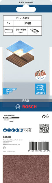 Banda de lija Bosch BfWP, 75 x 610 mm, G40, 3 unidades