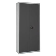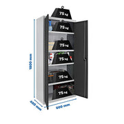 - Armario multiusos metálico gris/antracita con puertas antracita. Dispone de dos puertas y cuatro estantes con una capacidad de carga de 75 kg cada uno, certificada en el punto de flexión. Se entrega montado. Dimensiones del armario (alto x ancho x profundidad): 1800 x 600 x 400 mm. Fácil de manipular, sin bordes afilados. Recubrimiento de poliéster epoxi resistente a los arañazos e ignífugo. Fabricado en España.