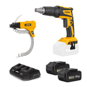 • Paquete profesional VITO con atornillador para paneles de yeso sin escobillas de 20 V (VIBCAGCB20), alimentador automático de tornillos, 2 baterías de 3 Ah y cargador rápido doble.