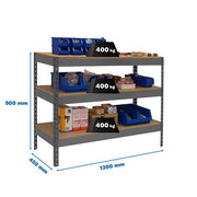 • Banco de trabajo metálico con tres estantes sin tornillos, de 900 x 1200 x 450 mm. Cada estante soporta 400 kg. Color gris/madera.