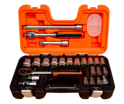 - Juegos de llaves de vaso hexagonales de 18 1/2": 10, 11, 12, 13, 14, 15, 16, 17, 18, 19, 20, 21, 22, 23, 24, 27, 30, 32 mm;