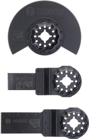 - 1 lâmina de serra de imersão Starlock BIM para madeira e metal; 1 lâmina de serra de imersão Starlock HCS para madeira; 1 lâmina de serra segmentada Starlock HCS para madeira.