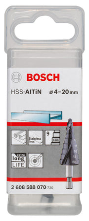 • A broca escalonada HSS realiza perfurações suaves e sem rebarbas em vários diâmetros com uma única broca