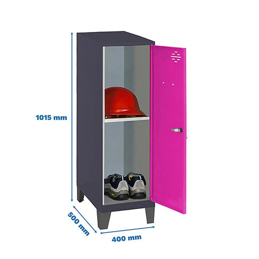 Ver detalhes completosVisão geral do produto: Mini armário metálico com pés CINZENTOS e portas ROSA. Dimensões: 1015 x 300 x 500 mm. Entregue montado, inclui ventilaçã...