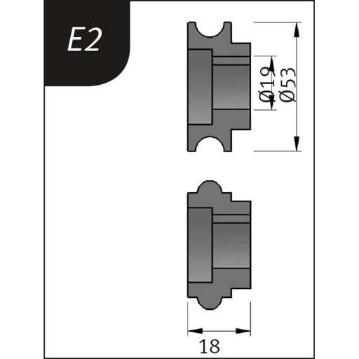 Visão geral do produto: Rolos de dobra Metallkraft (Tipo E2, Ø 53 x 19 x 18 mm). Mais informações disponíveis no catálogo (baixe abaixo).