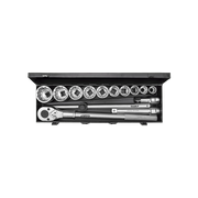 • Conjunto de 14 soquetes, incluindo uma alavanca de roquete, 2 barras de extensão e 10 soquetes.