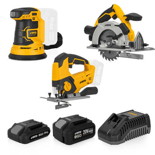 Ver detalhes completosVisão geral do produto: Este pacote da VITO (PACK3EGO) inclui uma lixadora orbital de 20V, uma serra tico-tico de 20V e uma serra circular de 20V...