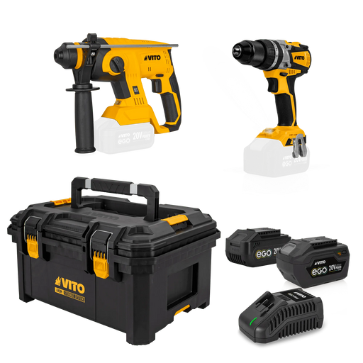 Ver detalhes completosVisão geral do produto: Este pacote da VITO (PACK5EGOIRON) inclui um berbequim combinado sem escovas de 20 V, um martelo rotativo sem escovas de ...