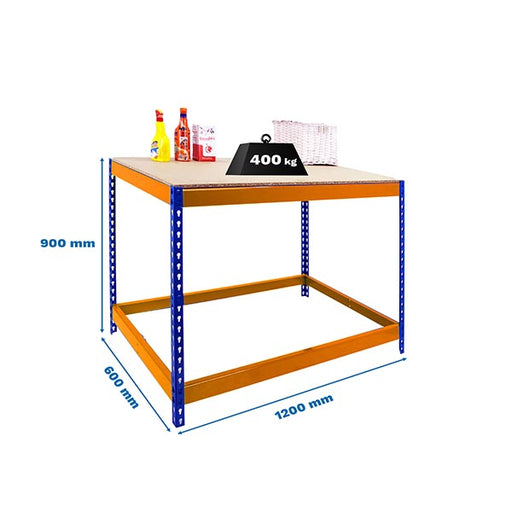 Visão geral do produto: Bancada de trabalho em metal azul/laranja/madeira com uma prateleira e montagem sem parafusos. Tem uma capacidade de carg...